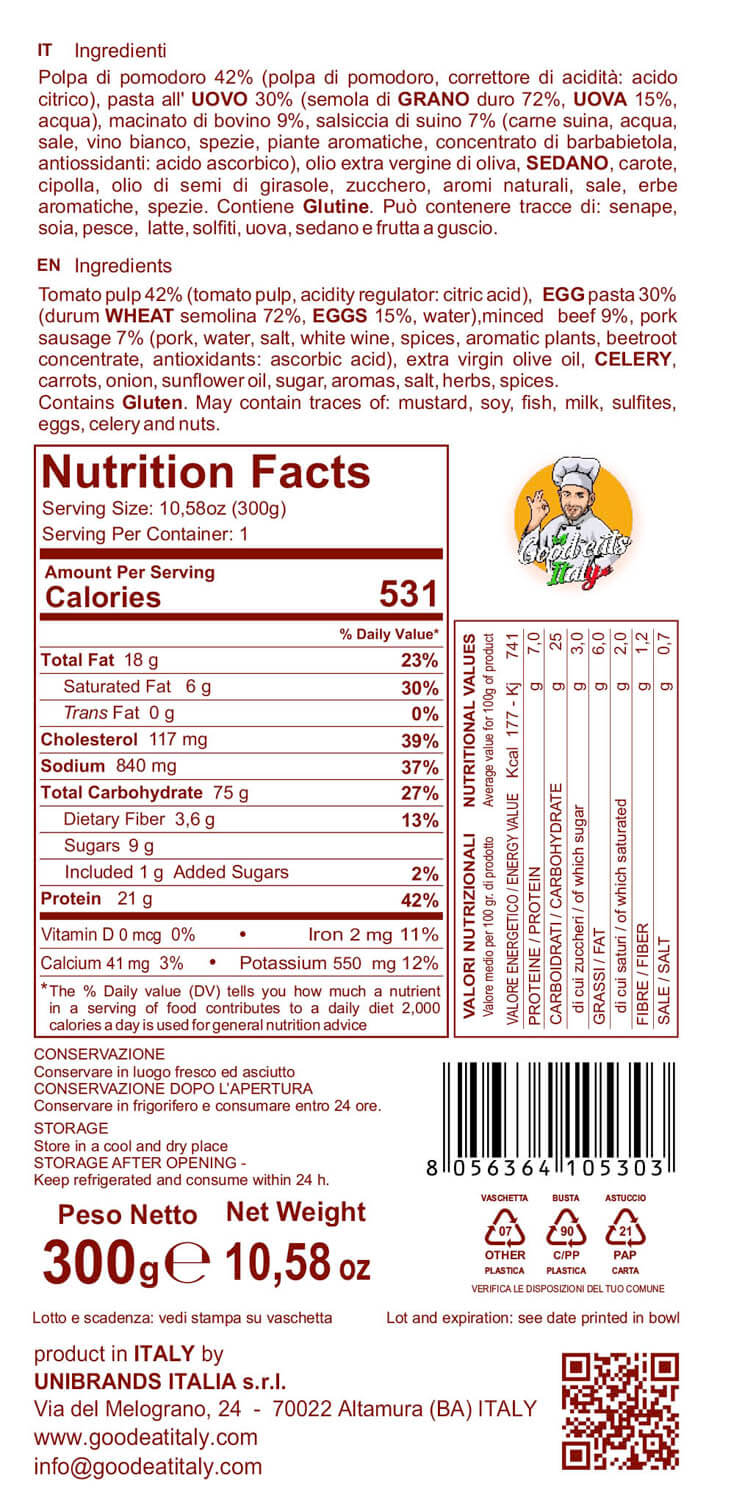 Tomatenpulp (tomatenpulp, zuurteregelaar: citroenzuur), pasta (durum TARWEGRIESMEEL, EIEREN), rundergehakt 9 %, varkensworst 7 % (varkensvlees, water, zout, witte wijn, specerijen, aromatische planten, rode bietenconcentraat, antioxidanten:ascorbinezuur), extra vergine olijfolie, SELDERIJ, wortelen, ui, zonnebloemolie, boter (MELK), suiker, aroma’s (SELDERIJ), zout, kruiden, specerijen. Bevat Gluten. Kan sporen bevatten van: vis, soja, gluten, melk, sulfieten, eieren, selderij en noten.