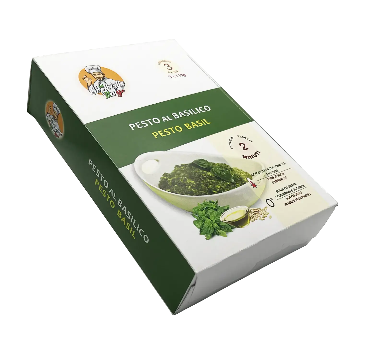 Half afgewerkte basilicum 38 % (basilicum 65 %, zonnebloemolie, zout), zonnebloemolie, aardappel, Grana Padano kaas 2 % (MELK, zout, stremsel, lysozym: eiwit van EI), natuurlijke aroma’s, PIJNBOOMPITTEN 0.7 %, aromatische kruiden. Bevat Gluten. Kan sporen bevatten van: vis, soja, gluten, melk, sulfieten, eieren, selderij en noten.