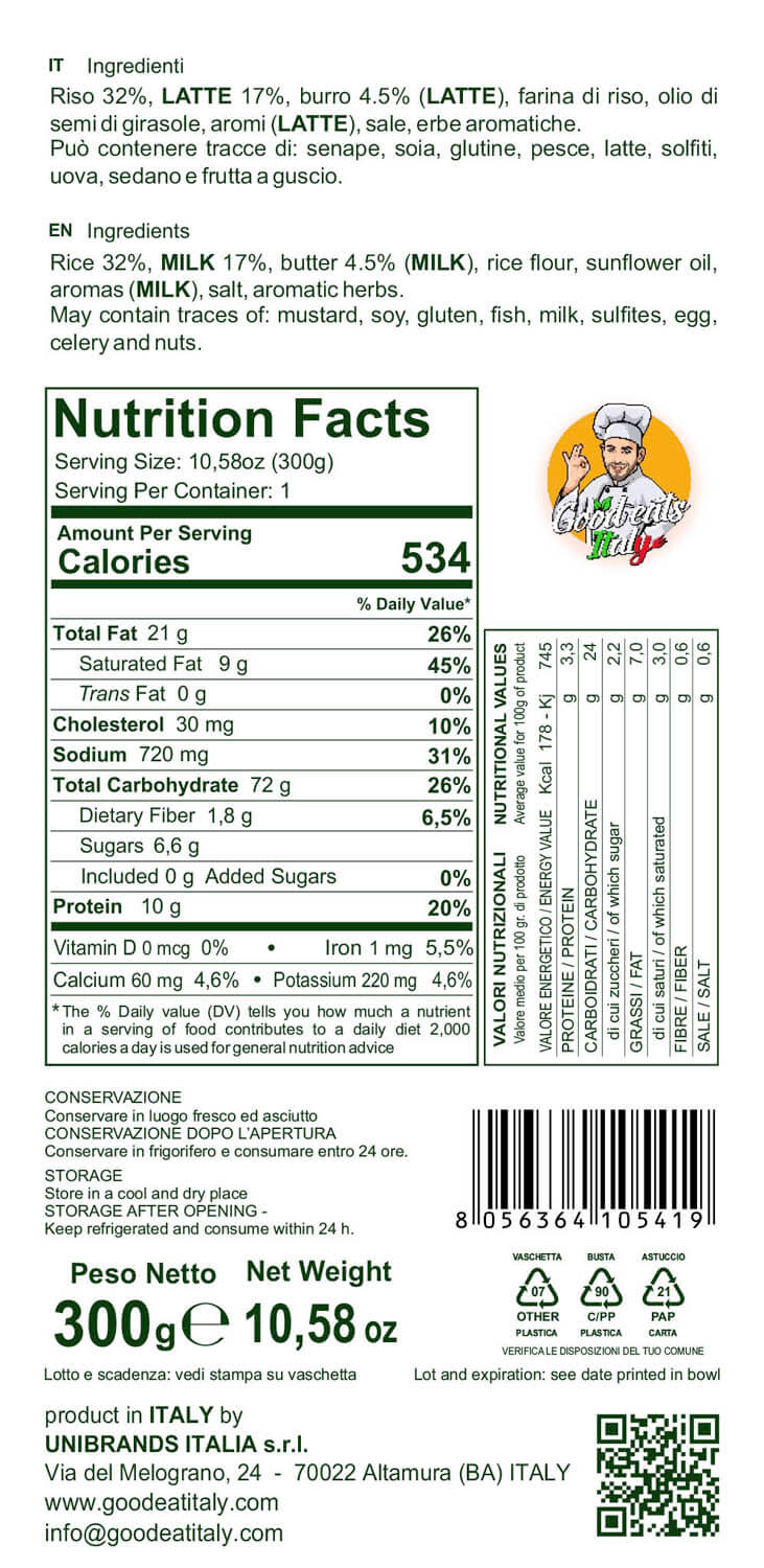 Water, rijst 32 %, MELK 17 %, boter 4.5 % (MELK), rijstmeel, zonnebloemolie, aroma’s (MELK), zout, aromatische kruiden. Kan sporen bevatten van vis, soja, gluten, melk, sulfieten, eieren, selderij en noten.