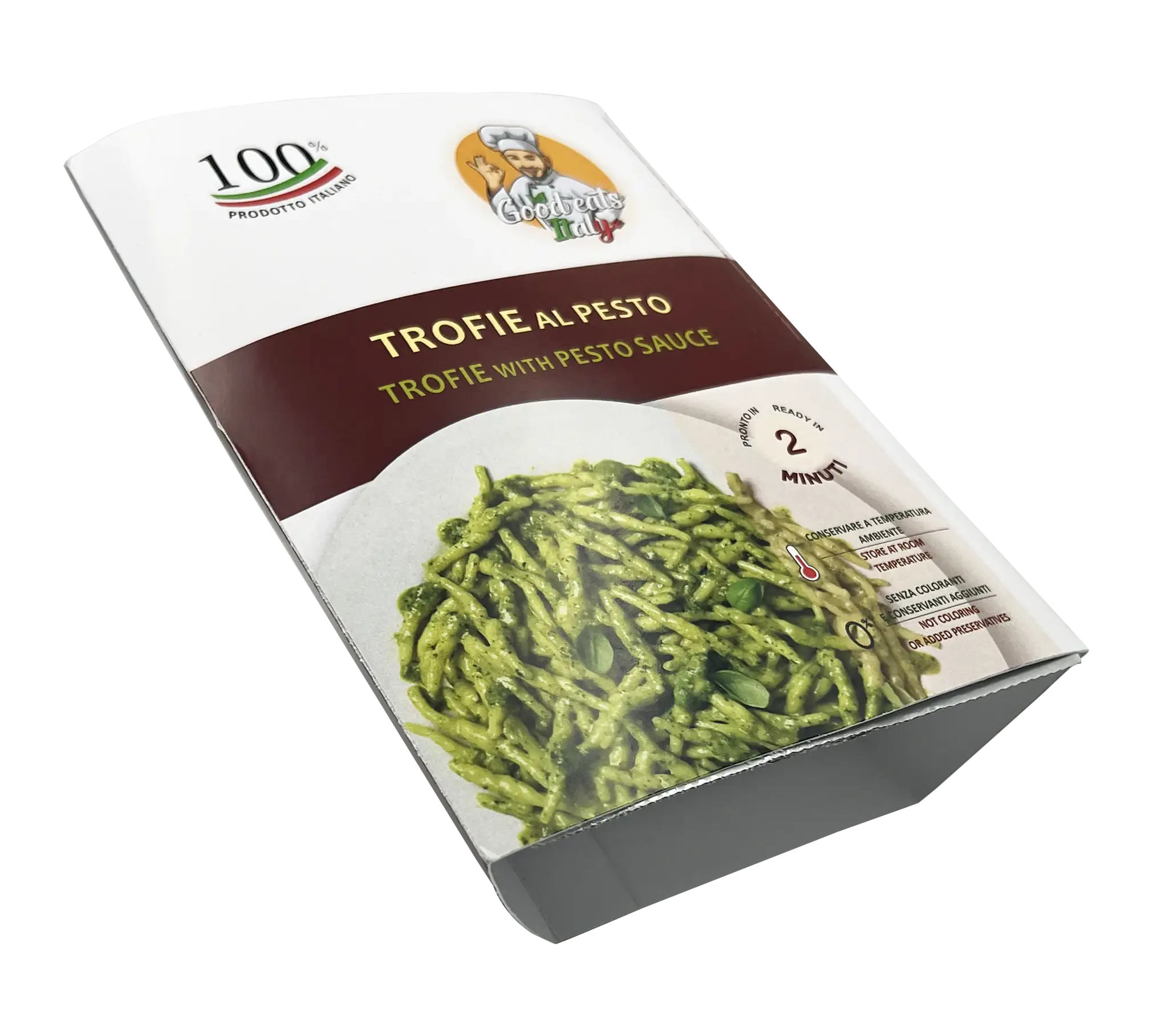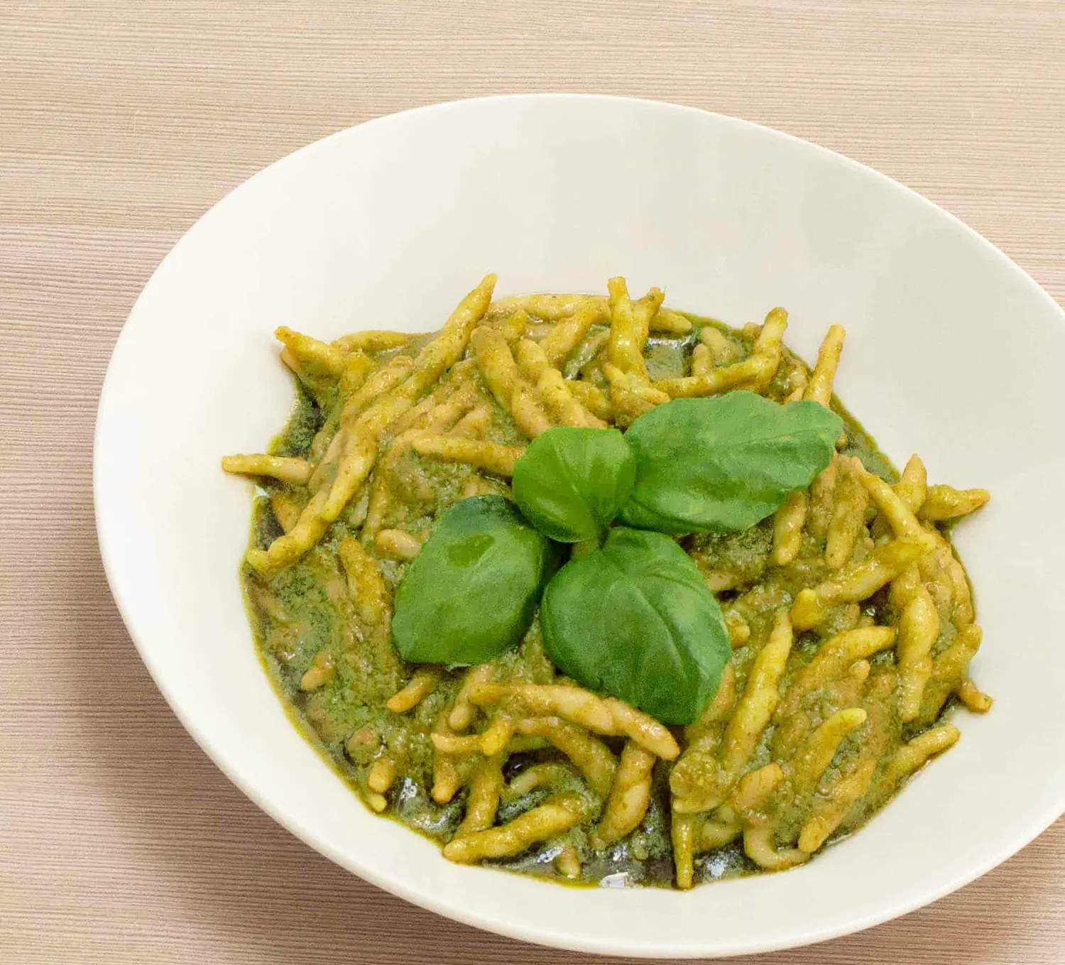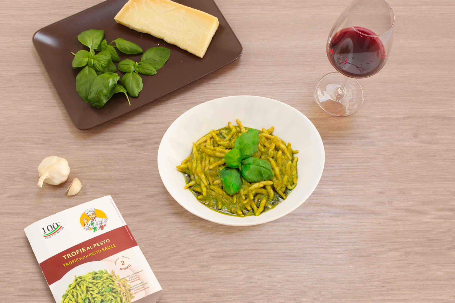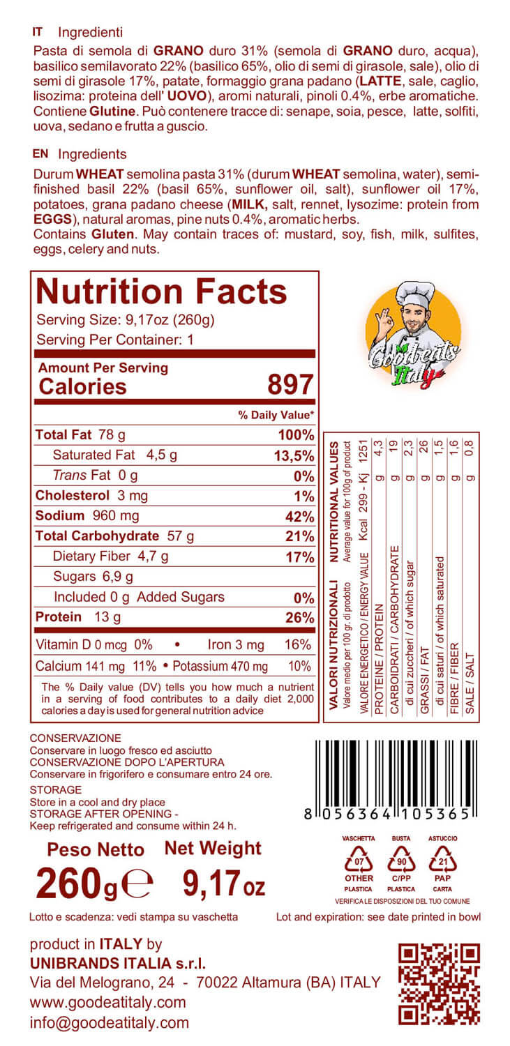 Durum TARWEGRIESMEEL pasta 31 % (durum TARWEGRIESMEEL, water), half afgewerkte basilicum 38 % (basilicum 65 %, zonnebloemolie, zout), zonnebloemolie, aardappel, Grana Padano kaas 2 % (MELK, zout, stremsel, lysozym: eiwit van EI), natuurlijke aroma’s, PIJNBOOMPITTEN 0.7 %, aromatische kruiden. Bevat Gluten. Kan sporen bevatten van: vis, soja, gluten, melk, sulfieten, eieren, selderij en noten.